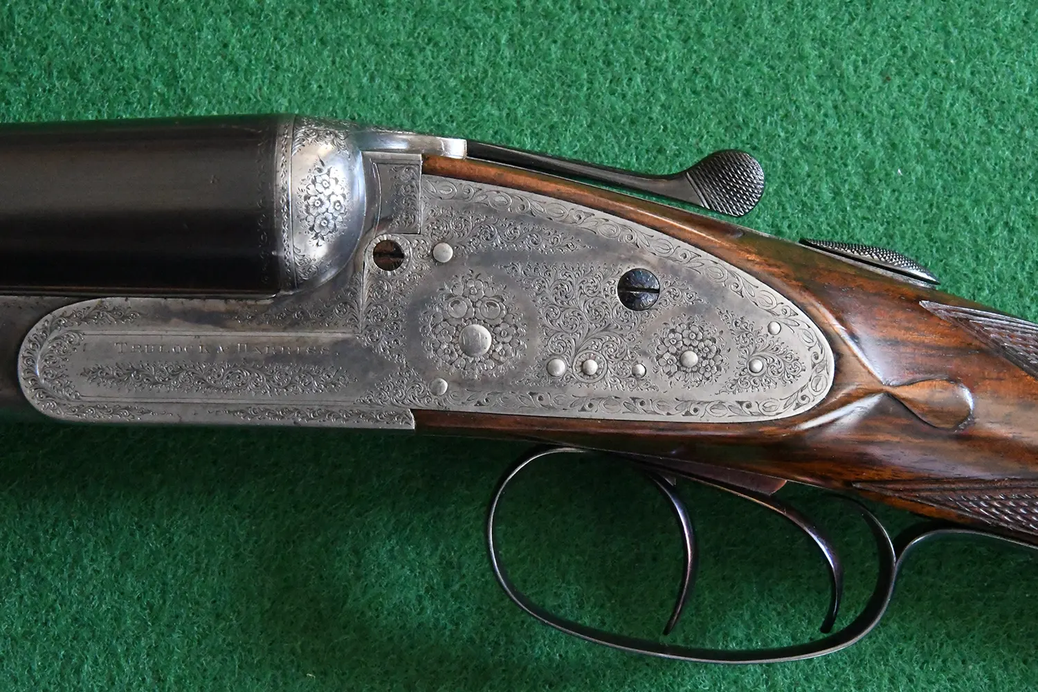 A fegyver csöveit gravírozott felirat díszíti, amelyen olvasható: ‘TRULOCK & HARRISS. 9. DAWSON ST. DUBLIN.’ A fegyveren található nagyon finom bouquet és scroll gravírozások, amelyeket stilizált levélszegélyek egészítenek ki.